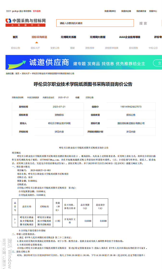 呼伦贝尔职业技术学院纸质图书采购项目询价公告
